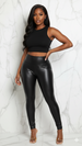 Get the look of leather without the stiff feel. Our high-waist faux leather leggings are made from a stretchy and soft fabric for a comfortable, figure-hugging fit. The sleek finish and high-rise waist create a flattering silhouette for any occasion. A must-have for a chic and modern wardrobe.