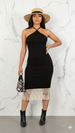 This Halter Neck Ribbed Fringe Midi Dress offers a refined blend of style and comfort. Crafted from a soft, stretchy fabric. It provides a flattering, body-hugging fit that accentuates your curves. The ribbed texture adds subtle depth, while the halter neckline elegantly showcases your shoulders. A statement fringe hem introduces a sophisticated yet playful element, making this dress ideal for chic evenings or special occasions. Pair it with heels and minimal accessories for a polished, expert look.